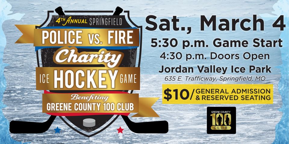 Jordan Valley Ice Park 635 E. Trafficway St., Springfield, MO, United StatesSpringfield Police face Springfield Firefighters in this ice hockey game, benefiting Greene County 100 Club. Don't miss this exciting event for a good cause, held at Jordan Valley Ice Park. The Greene County 100 club is a 501(C)3, not-for-profit organization that provides financial support to the surviving spouse and dependent children of police officers and... Read more »
